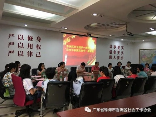 为更深入地了解香洲区社会组织一线社工的工作和生活情况,促进社工行业的交流与发展。2017年9月26日上午,由香洲区社会建设创新专项资金资助,香洲区社会工作协会主办的香洲区社会组织一线社工“欢度中秋国庆佳节”座谈会在香洲区民政局会议室举行。香洲区委政法委负责人、香洲区民政局代表以及香洲区社会组织一线社工代表共30人参加了本次座谈会。